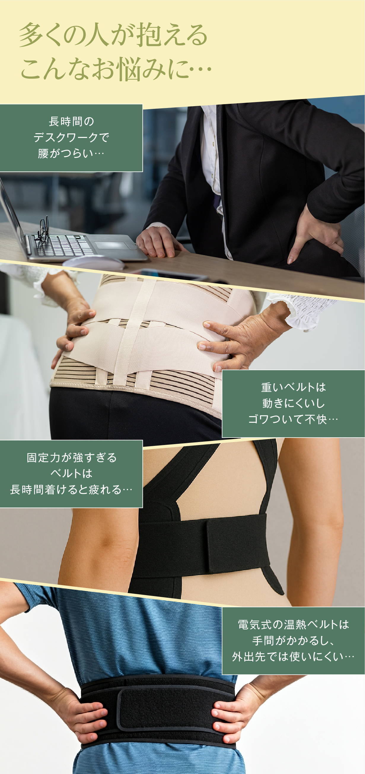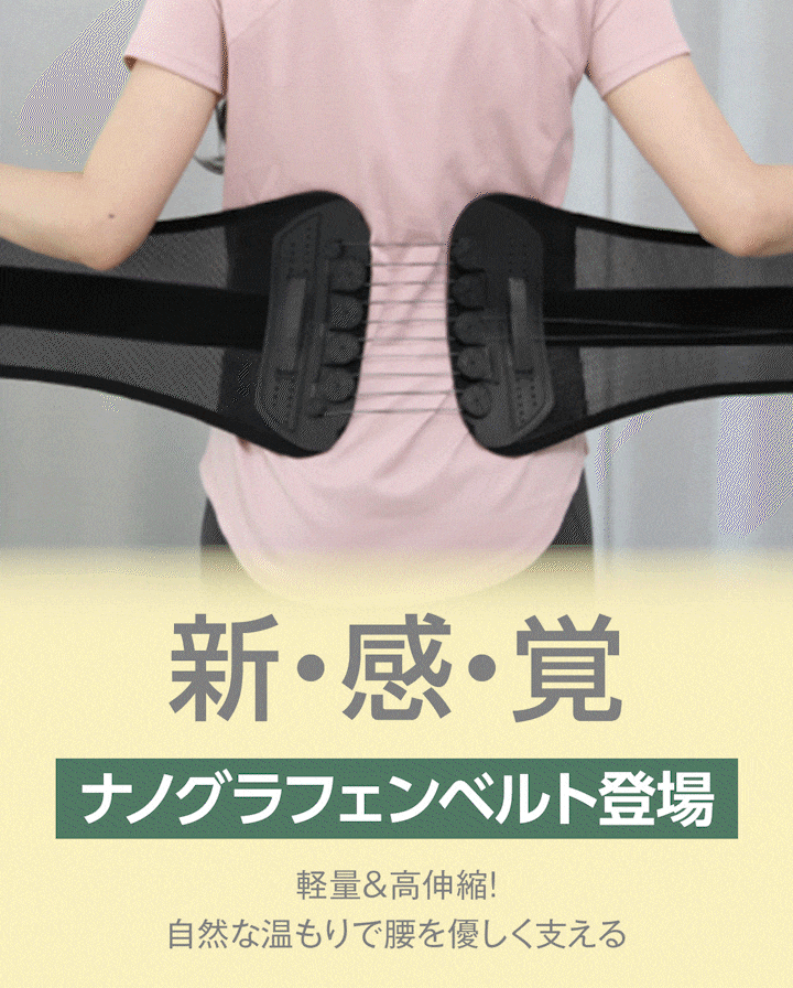 そこでおすすめしたいのが、背骨の自然なカーブを考慮した設計のサポートベルトです。 このようなベルトを活用することで、腰部への負担を減らし、筋肉の負担を和らげながら、正しい姿勢を意識づけるサポートができます。
