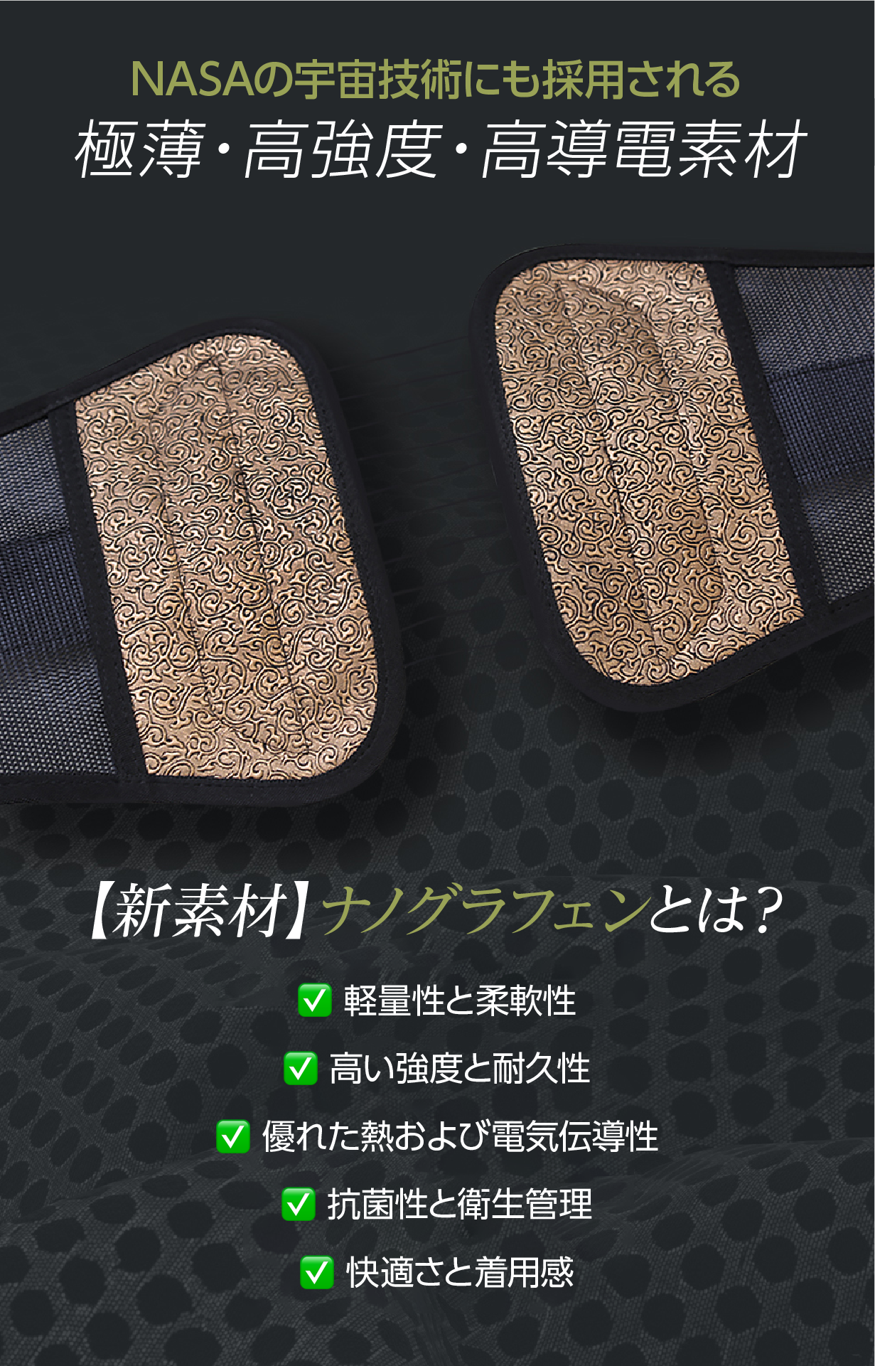 ナノグラフェン素材は耐久性にも優れており、シーズンをまたいで長く使えるコスパ抜群のベルトです。