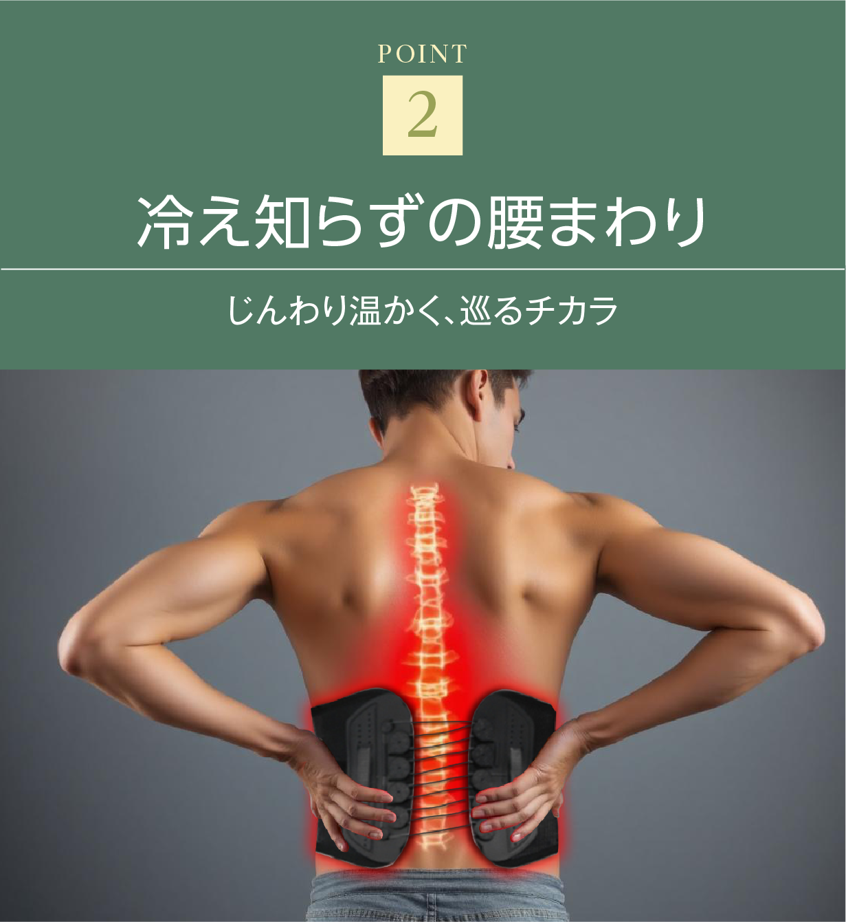 体温に反応し、遠赤外線を放射して腰を芯からじんわり温めます。